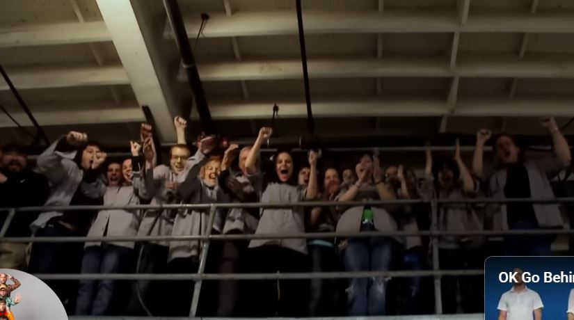 ์ดํฌ๋ก ๋ด๊ณ ์์ด. ์๋ฐฑ ๊ฐ์ ์ฅ์น๋ค์ด ์๋ํ ๋์, OK Go ๋ฉค๋ฒ๋ค์ด ํ์ธํธ๋ฅผ ๋ค์ง์ด์ฐ๋ฉฐ ๋